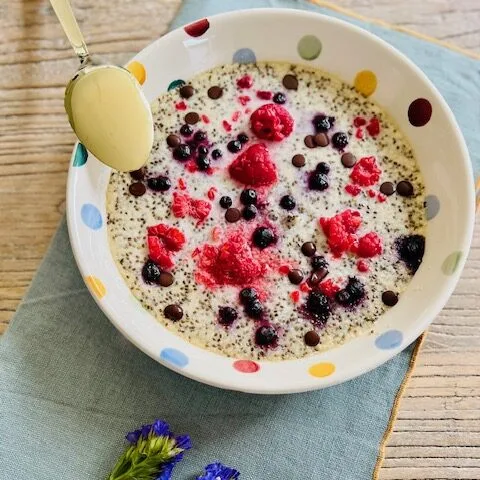 Du kannst das Keto Porridge nach belieben mit Zimt, Kardamom oder ein paar Tropfen Vanille Aroma verfeinern und mit ein paar frischen oder getrockneten Beeren toppen.