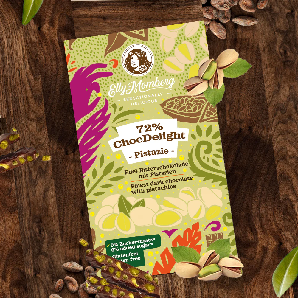 Mit viel Liebe handgefertigt, ist ChocDelight 72 % – mit Pistazien für alle, die hochwertige, geschmacksintensive Schokolade ohne Kompromisse genießen möchten.
