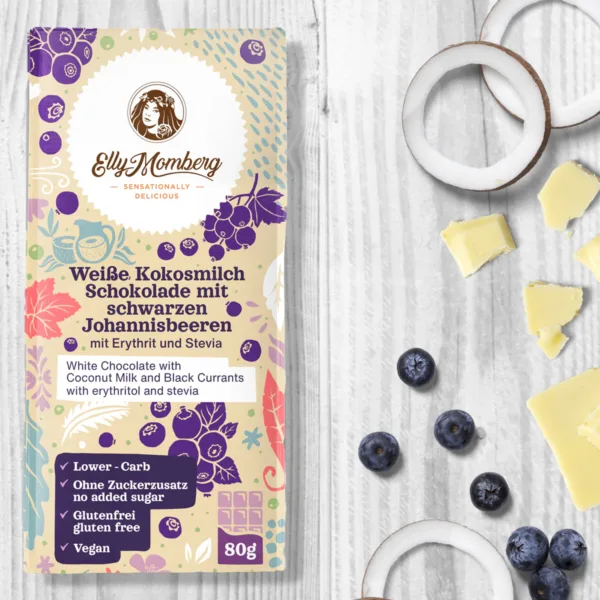 Zutaten:Kakaobutter (40%), Kokosmilchpulver (24%), Erythrit (17%), Steviolglycoside (0,01%), Ballaststoffe (Inulin, Polydextrose), gefriergetrocknete ganze schwarze Johannisbeeren (4,9%), Tapiokastärke, Emulgator (Sonnenblumenlecithin), Aroma.